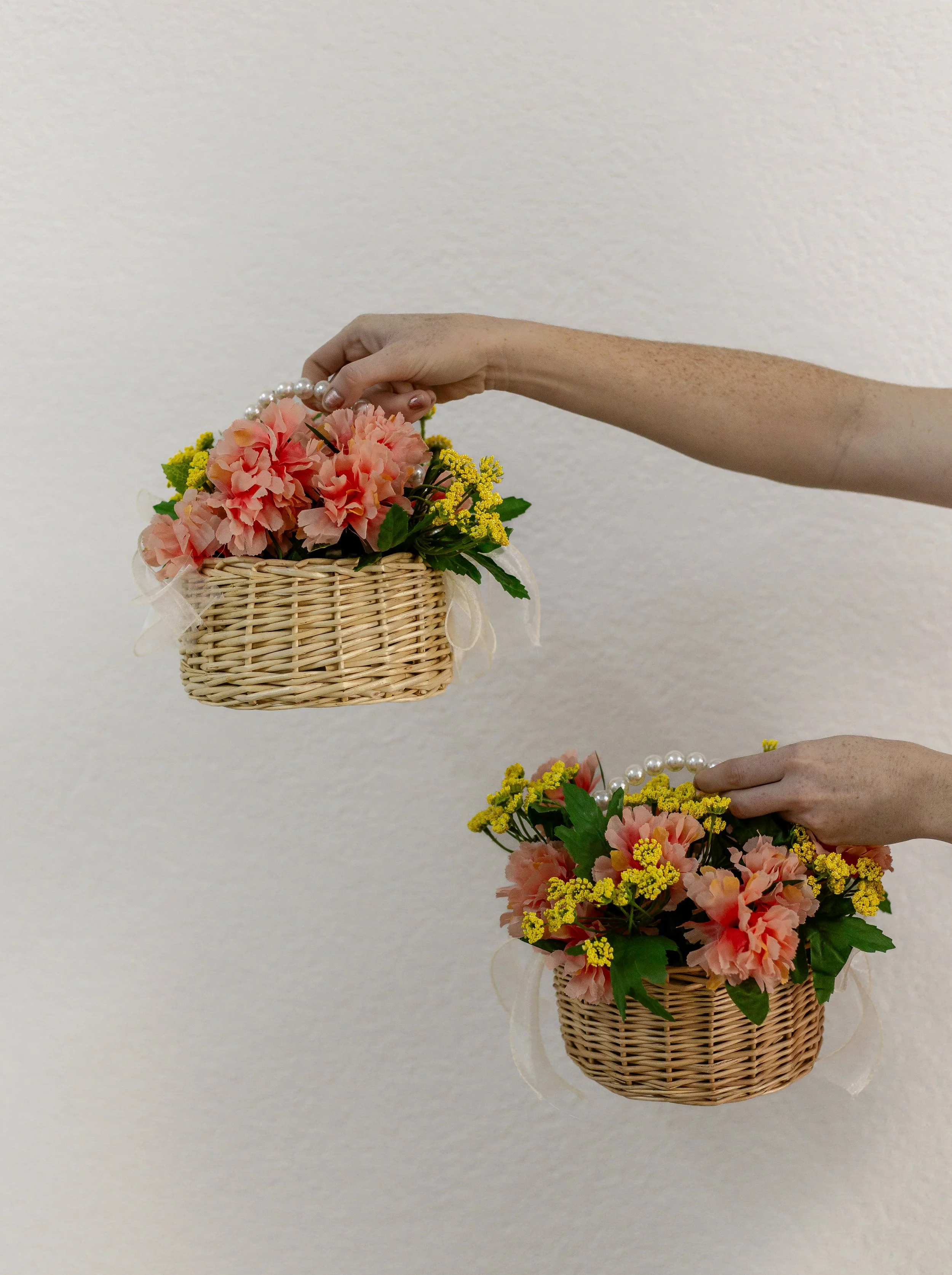 2 mini flower baskets filled with peach and pink flowers.
